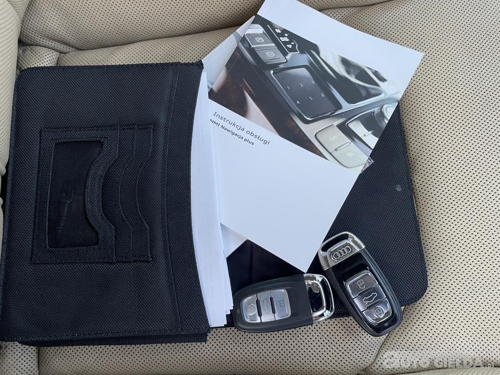 6xAir Bag, skórzana tapicerka, napęd 4x4 quattro, czujniki parkowania przód i tył- kamery 360-asystent parkowania, alu 18-20 opony zimowe i lato, reg. wys kierownicy, ele. ust. podgrz. i składane lusterka, ele. otw. 4x szyby, tempomat aktywny z radarem, komputer pokładowy - język Polski, wielof. skórzana kierownica, klimatronik czterostrefowy, ele. ust. pompowane- wentylowane i podgrz. fotele z pamięcią, zamykanie i otwieranie szyb z pilota, automatyczna skrzynia 8 biegów- sterowanie w kierownicy, media music interface- CD Stereo-HDD dysk-2x SD karty- DVD - SIM- USB nagłośnienie Bose, nawigacja duża- aktualna mapa Europy i Polski menu Polskie, reflektory Ful LED z spryskiwaczami- dzienne światła Led- światła długie automatyczne, sensor deszczu, ESP, ASR, ABS, podłokietnik, ele. otw. tylna klapa, start/stop ( wyłączony ) - pełne KeyLessGo otwieranie- zamykanie-odpalanie auta bez klucza, pneumatyczne zawieszenie regulowana wysokość- Audi drive Select 4 tryby pracy, klimatyzowany schowek, Alarm, Immobilizer, migacze w lusterkach ledowe pulsujące, oświetlenie Ambiente Led środek i dojścia do auta, System głosowego zarządzania multimediami i telefonem Bluetooth - sim karta -telefon przenośny, auto. ściemniane lusterka, przyciemniane tylne szyby, czujniki ciśnienia opon, aktywny wydech, kamera czytania znaków drogowych, Auto-Hold, tylna lotka ele. wysuwana, domykanie automat. Drzwi Soft Close, Isofix przód i tył, hak 2100/750kg, systemy bezpieczeństwa - Radar Audi Side Assist, Audi Braking Guard, Komplet kluczy i doku., przegląd tech. ważny do 2027.02., serwis olejowy skrzyni biegów przy 238 tys km., łańcuch rozrządu wymiana przy 161 tys. km, ostatni serwis olejowy silnika plus filtry i łożyska kół przód przy 245 tys.km., 2026.01. serwis zawieszenia i wtryski nowe, I rejestracja auta 2013.11., polisa OC ważna do 2026.08., nowe oryginalne wykładziny gumowe, automatyczny wskaźnik oleju plus miarka manualna, Kupiony w Polsce-salon, auto zadbane bez wkładu finansowego.