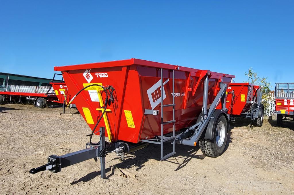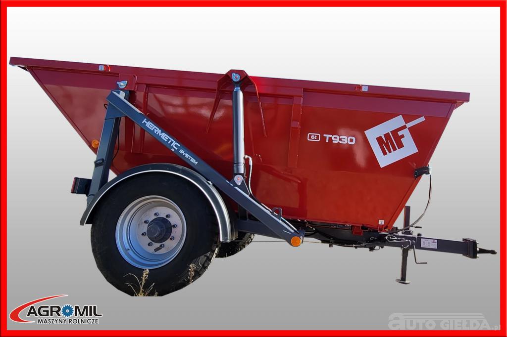 Praktyczna i niewielka przyczepa skorupowa T930 może transportować materiał o wadze nieprzekraczającej 6 ton. Przyczepa została zbudowana w oparciu o nadwozie typu koleba. Umożliwia jednostronny wywrót ? tylny, ale uwagę zwraca znaczny wychył ? niemal do kąta prostego. Rozładunek ? wychył jest wspomagany poprzez zainstalowane dwa trwałe siłowniki hydrauliczne. Maszyna została wyposażona w pełną instalację elektryczną umożliwiającą jej transport po drogach publicznych. Ogumienie 385/65 R22,5 zapewnia możliwość bezpieczną pracę w terenach podmokłych i torfowych. Sprzęt został wyposażony w jednoosiowy układ jezdny, hamulec pneumatyczny i mechaniczną stopkę podporową. Przyczepa posiada również hamulec postojowy uruchamiany manualnie.
